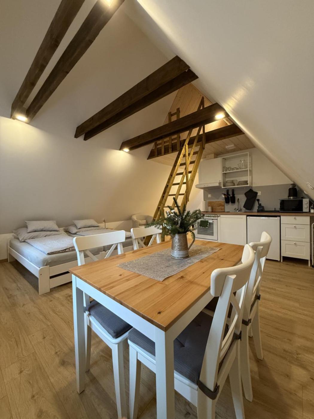 Studio Apartment. This apartment is comprised of 1 living room, 1 separate bedroom and 1 bathroom with a shower and a hairdryer. Meals can be prepared in the well-fitted kitchenette, which is fitted with a stovetop, a refrigerator, kitchenware and an oven. Among the room amenities are a tea and coffee maker, a dining area and a wardrobe as well as a quiet street view. The unit offers 5 beds. ;