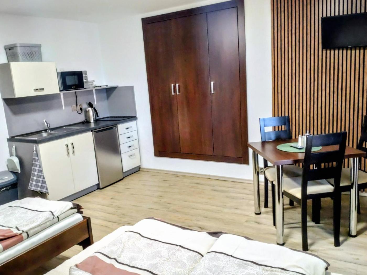Quadruple Room. Providing free toiletries, this quadruple room includes a private bathroom with a shower and a hairdryer. Guests can make meals in the kitchenette that comes with a stovetop, a refrigerator, kitchenware and a microwave. The quadruple room provides a flat-screen TV, a wardrobe, an electric kettle and heating. The unit offers 3 beds. ;