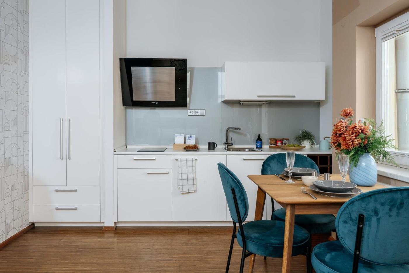 Studio Apartment. This apartment is comprised of 1 living room, 1 separate bedroom and 1 bathroom with a shower and free toiletries. Meals can be prepared in the well-fitted kitchenette, which is fitted with a stovetop, a refrigerator, kitchenware and a microwave. The apartment features parquet floors, a seating area with a flat-screen TV with streaming services, a tea and coffee maker, a dining area, as well as a wardrobe. The unit offers 2 beds.